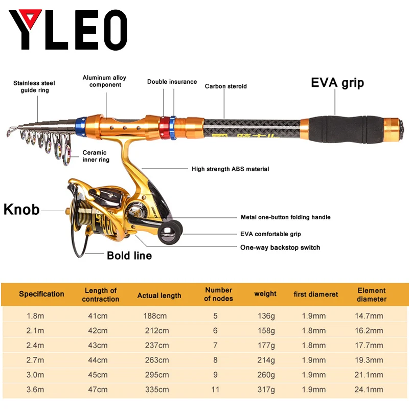 HIGH QUALITY YLEO Super Hard Portable Telescopic Fishing Rods Carbon Fiber Mini Fishing Pole 1.8-3.6m Gold Fishi
